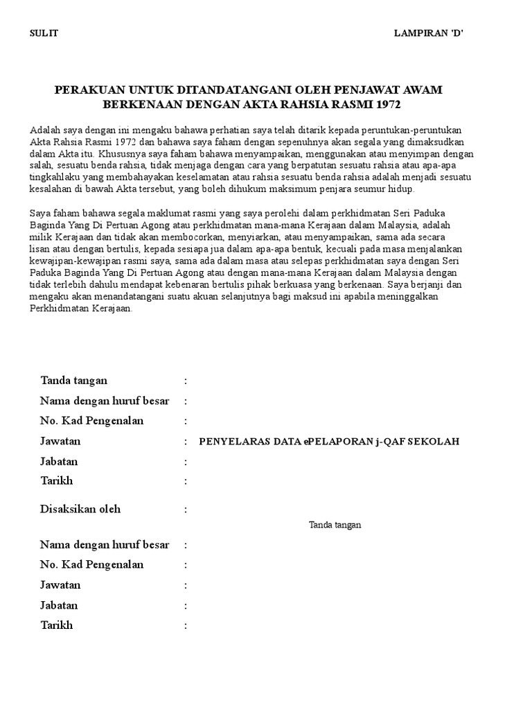 Borang Akta Rahsia Rasmi 1972 Lampiran D